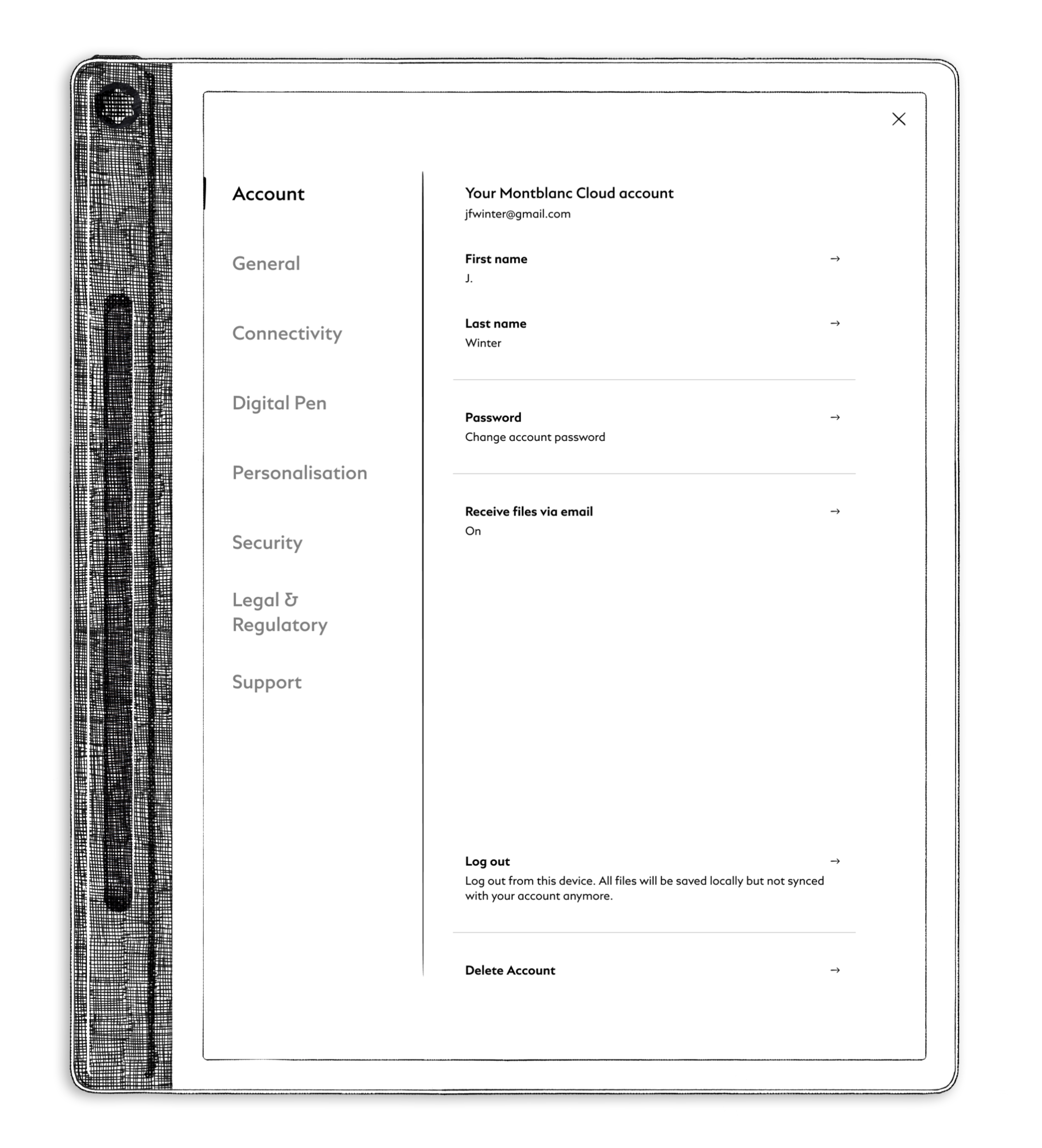 Sobald Ihr Montblanc Cloud Konto eingerichtet und mit Ihrem Montblanc Digital Paper gekoppelt ist, können Sie Ihre Kontoeinstellungen direkt auf dem Gerät verwalten. In diesem Artikel erfahren Sie, welche Optionen Ihnen nach der Anmeldung zur ...