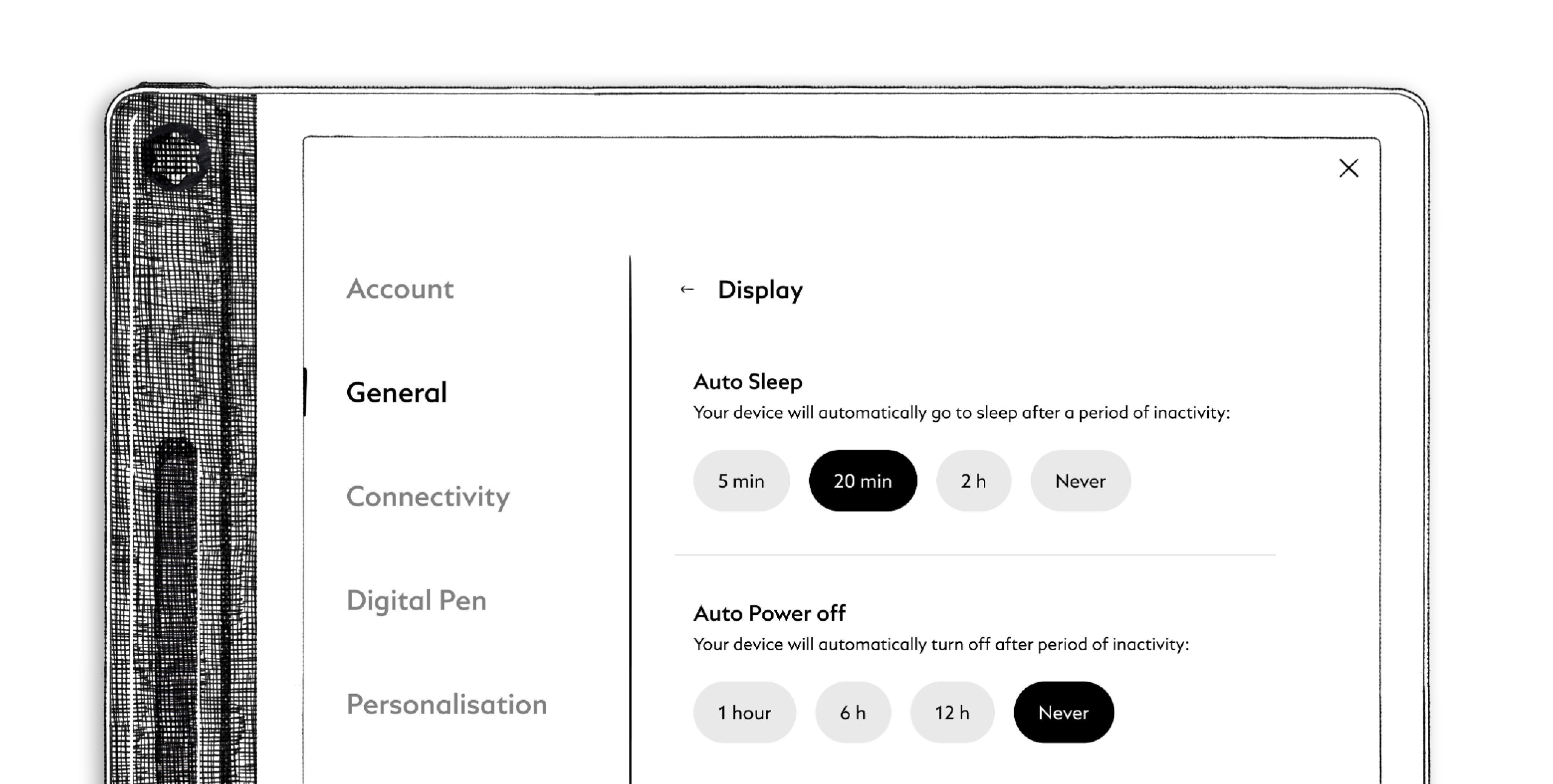 Der Ruhemodus legt fest, wie lange Ihr Digital Paper ohne Eingabe bleibt, bevor es in den Schlafbildschirm wechselt. Dadurch wird der Akku geschont, und das Gerät bleibt vor unbeabsichtigten Eingaben geschützt.