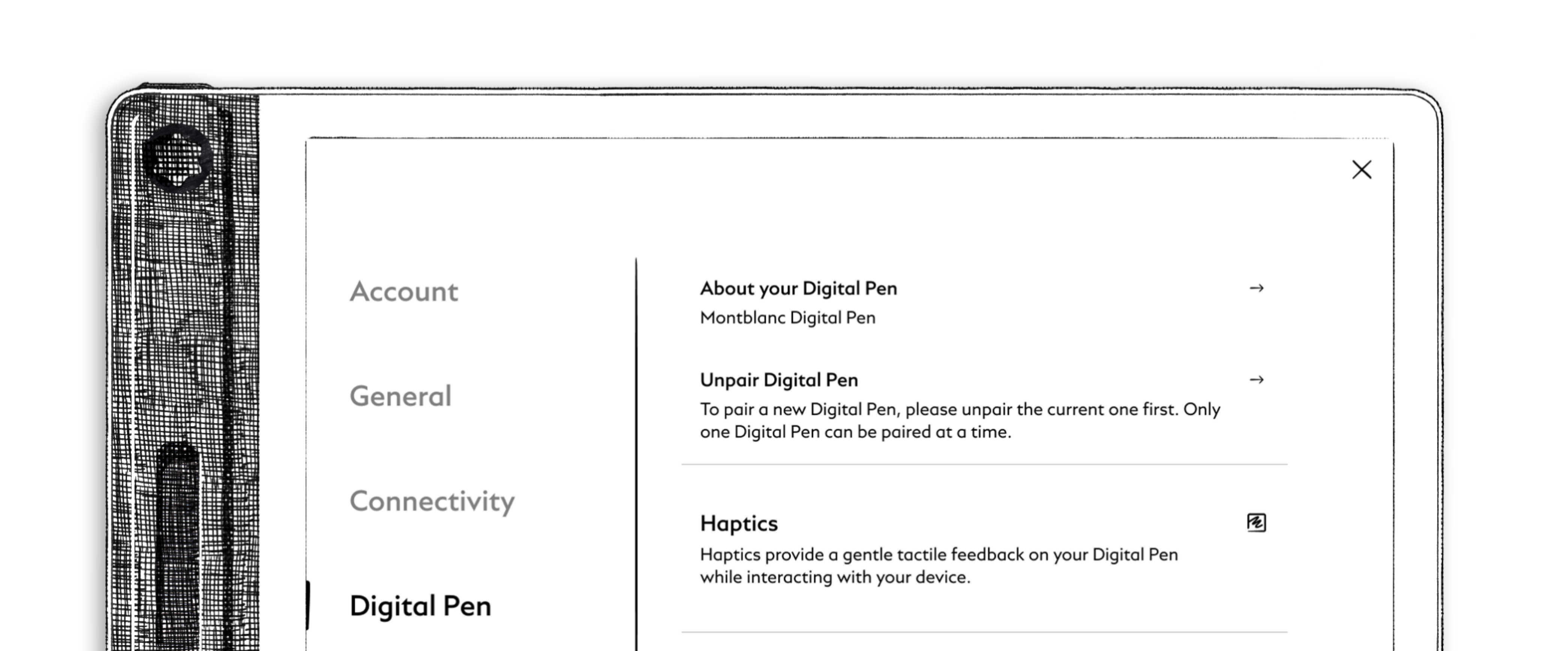 The Montblanc Digital Pen includes subtle haptic feedback to enrich the writing experience. These light vibrations provide a tactile sense of confirmation when actions are recognized, helping the pen feel more natural, intuitive, and connected—bridging the gap between digital interaction and writing on real paper.