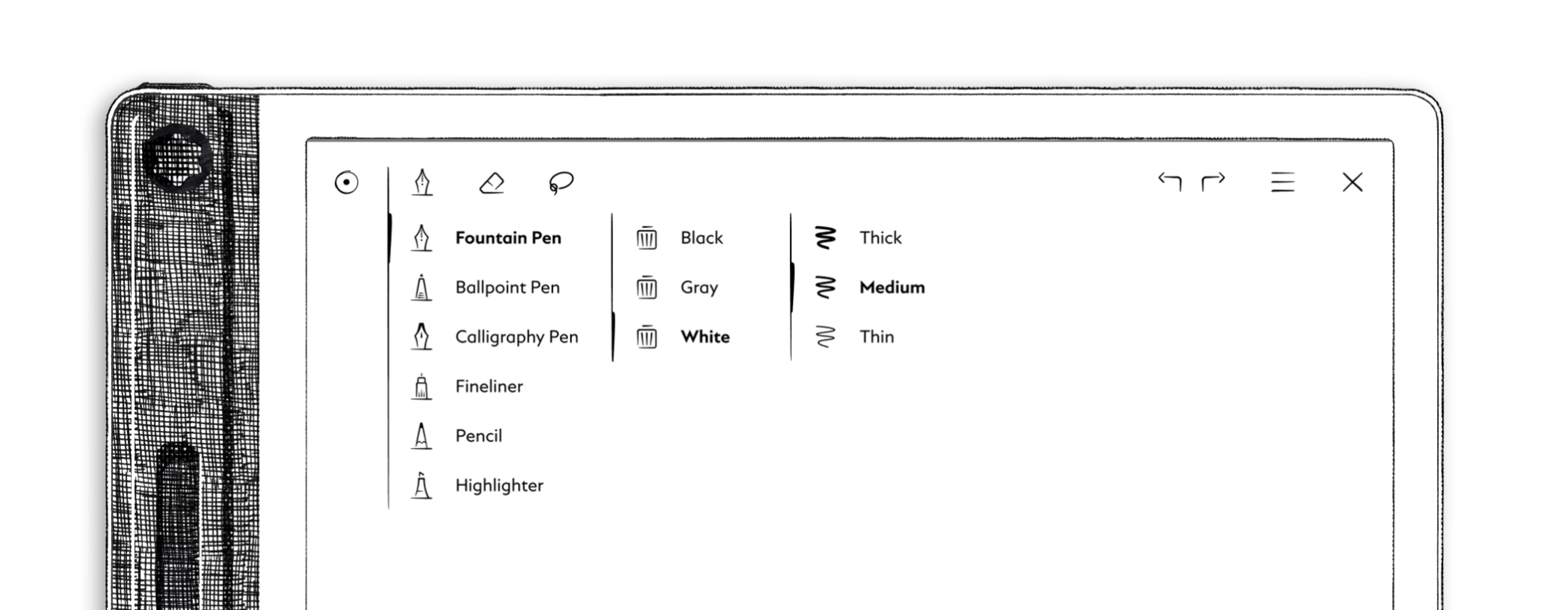 - Writing tools: Includes pens, pencils, highlighters, and more. Each tool can be customized by color (black, gray, white) and thickness (fine, medium, broad).