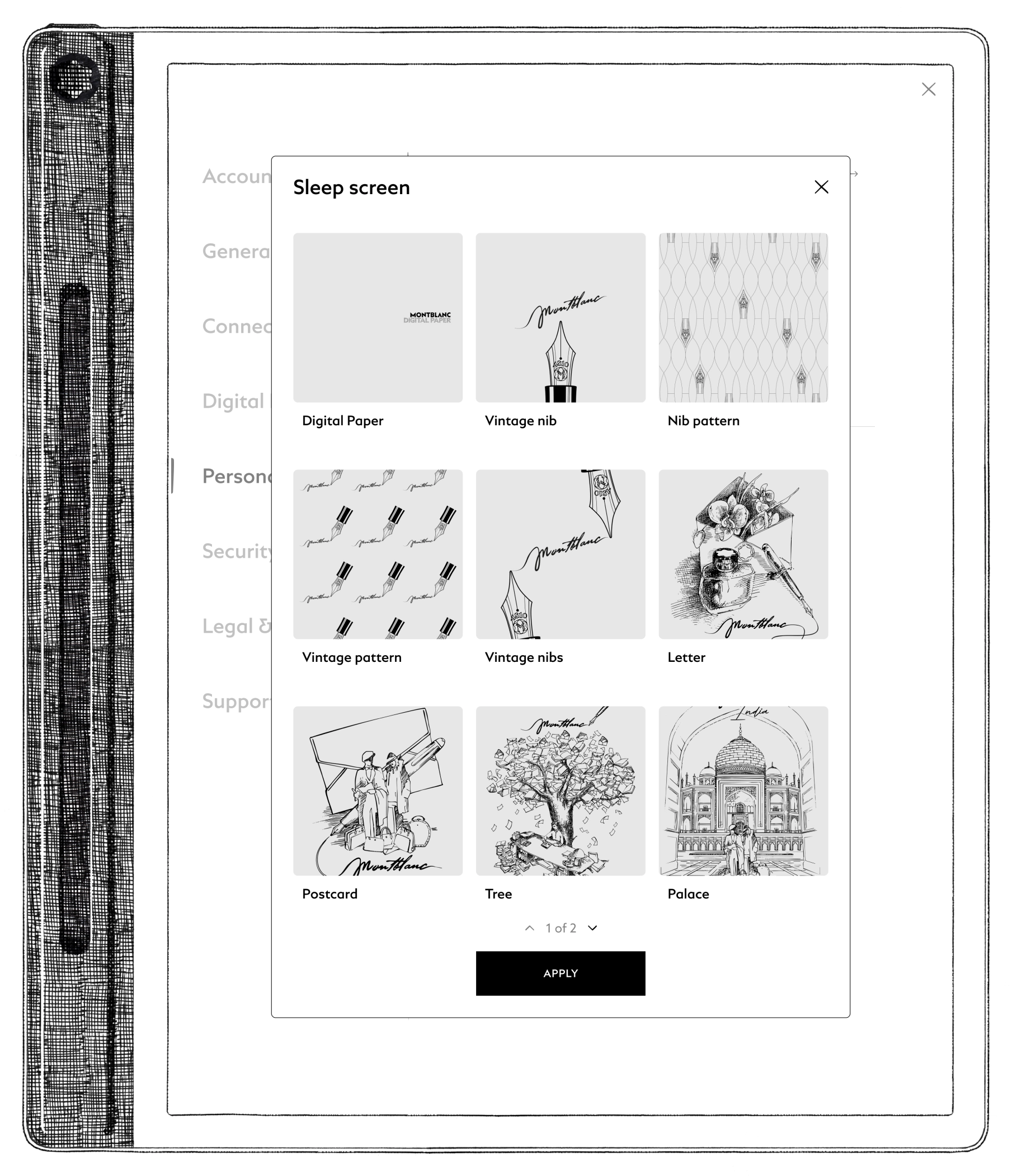 Montblanc Digital Paper のスリープ画面が自動で更新されるようになりました。デバイスをロックするたびに新しいビジュアルが表示され、さまざまな都市のイラストやブランドデザインなど、多彩なビジュアルを順番に楽しむことができます。